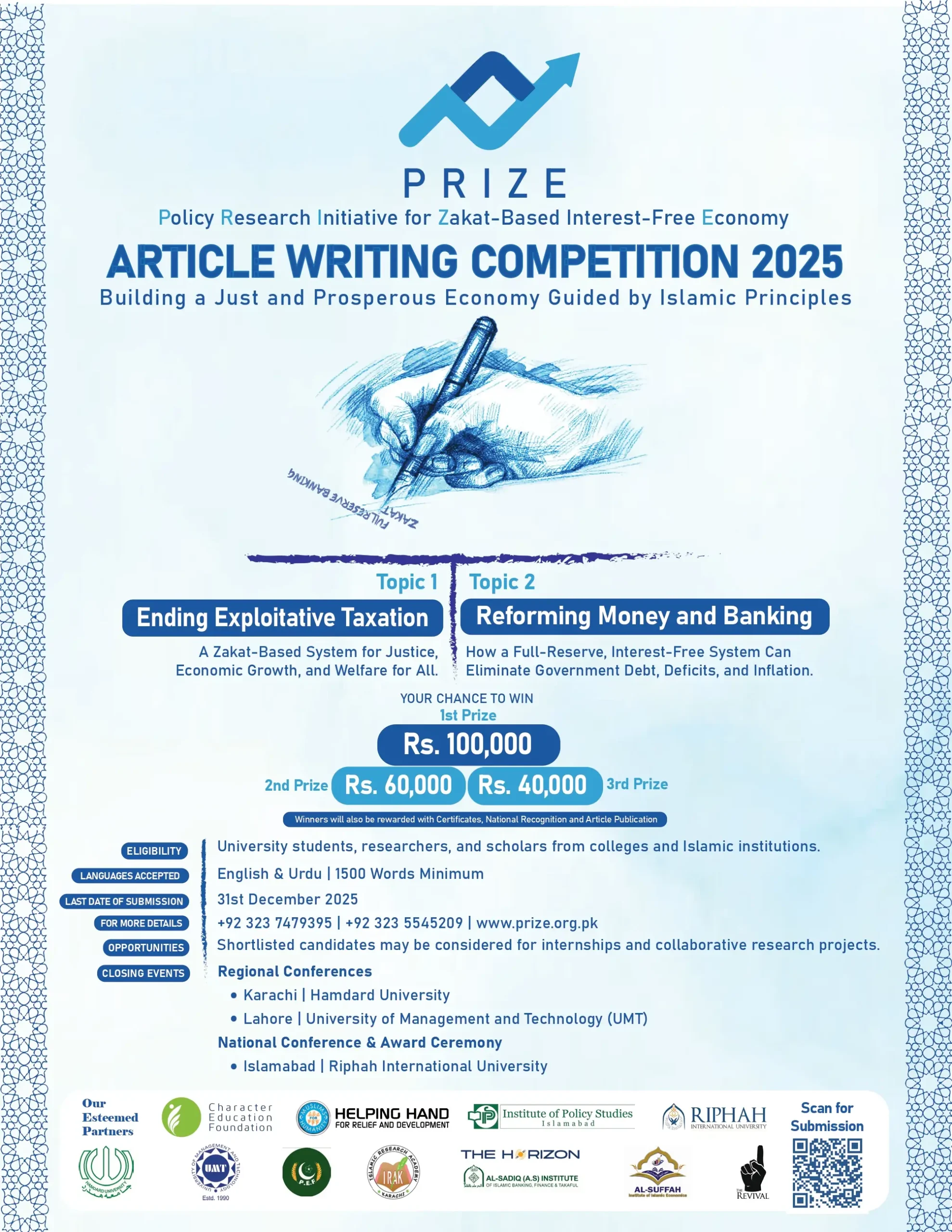 The National Article Writing Competition 2025 is a flagship youth initiative of PRIZE, designed to empower the next generation of thinkers, researchers, and leaders. This competition provides a platform for young minds to critically examine today’s exploitative financial structures and present innovative, Islamic economic alternatives rooted in justice, equity, and sustainability.
